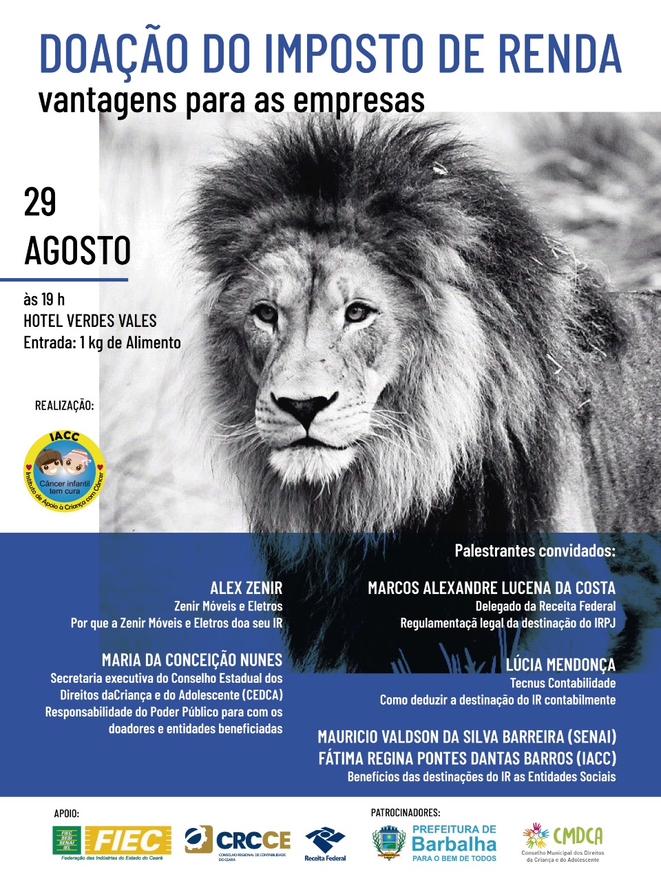 O evento conta com o apoio da Receita Federal e terá como palestrantes convidados: Marcos Alexandre (Delegado da Receita Federal); Alex Zenir (Zenir Móveis e Eletros); Maria da Conceição (Secretaria Executiva do Conselho Estadual dos Direitos da Criança e do Adolescente – CEDCA) e Lúcia Mendonça (Tecnus Contabilidade).