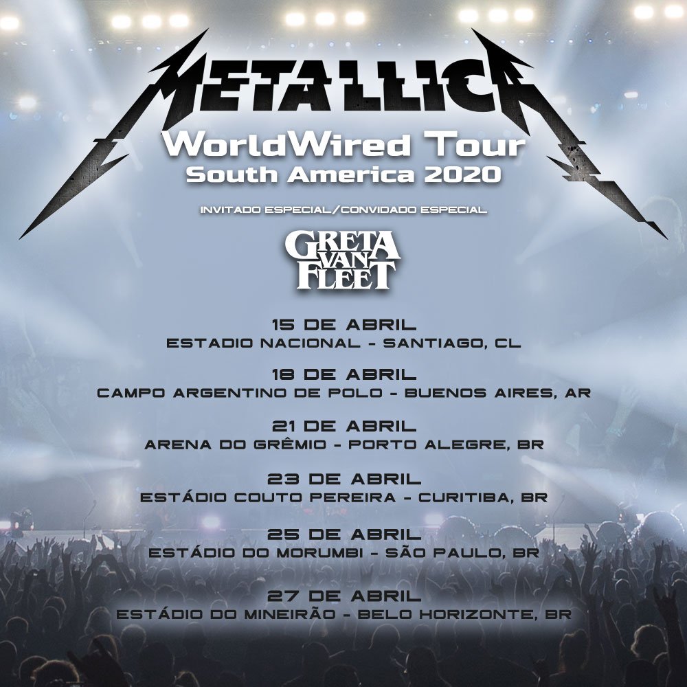O Metallica confirmou, que fará quatro shows em estádios do Brasil em 2020. As apresentações na Arena do Grêmio em Porto Alegre (21/4), no Couto Pereira em Curitiba (23/4), no Morumbi em São Paulo (25/4) e no Mineirão em Belo Horizonte (27/4) contarão com abertura do Greta Van Fleet.