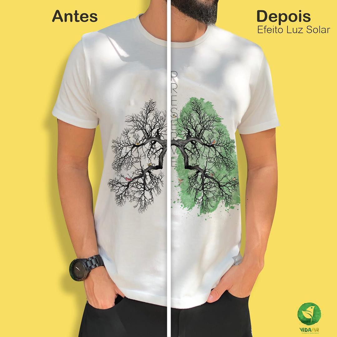 Os tecidos feitos de garrafas PET recicladas também compõem as camisetas da VIDABR, marca que possui bastante reconhecimento e prestígio no mercado de moda sustentável no Brasil. Além da grande variedade de camisetas que transmitem mensagem de suporte à luta pela preservação do meio ambiente, a VIDABR trabalha em suas roupas com efeito na luz solar, uma tecnologia inspirada na fotossíntese que permite que alguns ícones apareçam apenas sob a luz do Sol, criando relações curiosas de interação em uma mesma estampa. Vale a pena conferir!
